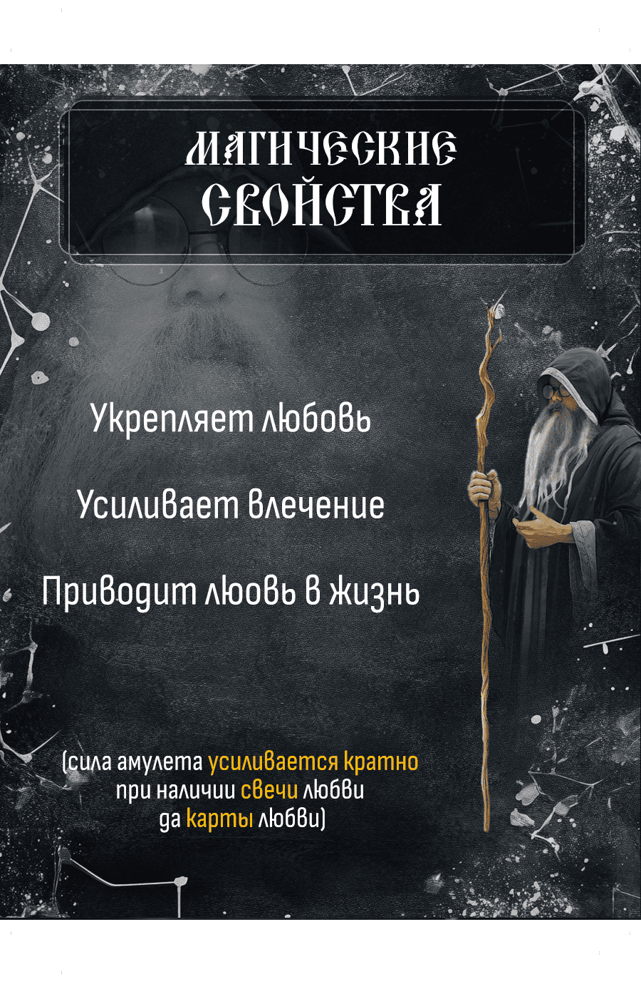 Амулет усиливает твои намерения и помогает направить их в нужное русло. Она способствует гармонии в отношениях, усиливая взаимопонимание и привязанность между любящими сердцами. Амулет создаёт защитное поле вокруг твоей любви, оберегая её от негативных влияний и поддерживая её пламя.