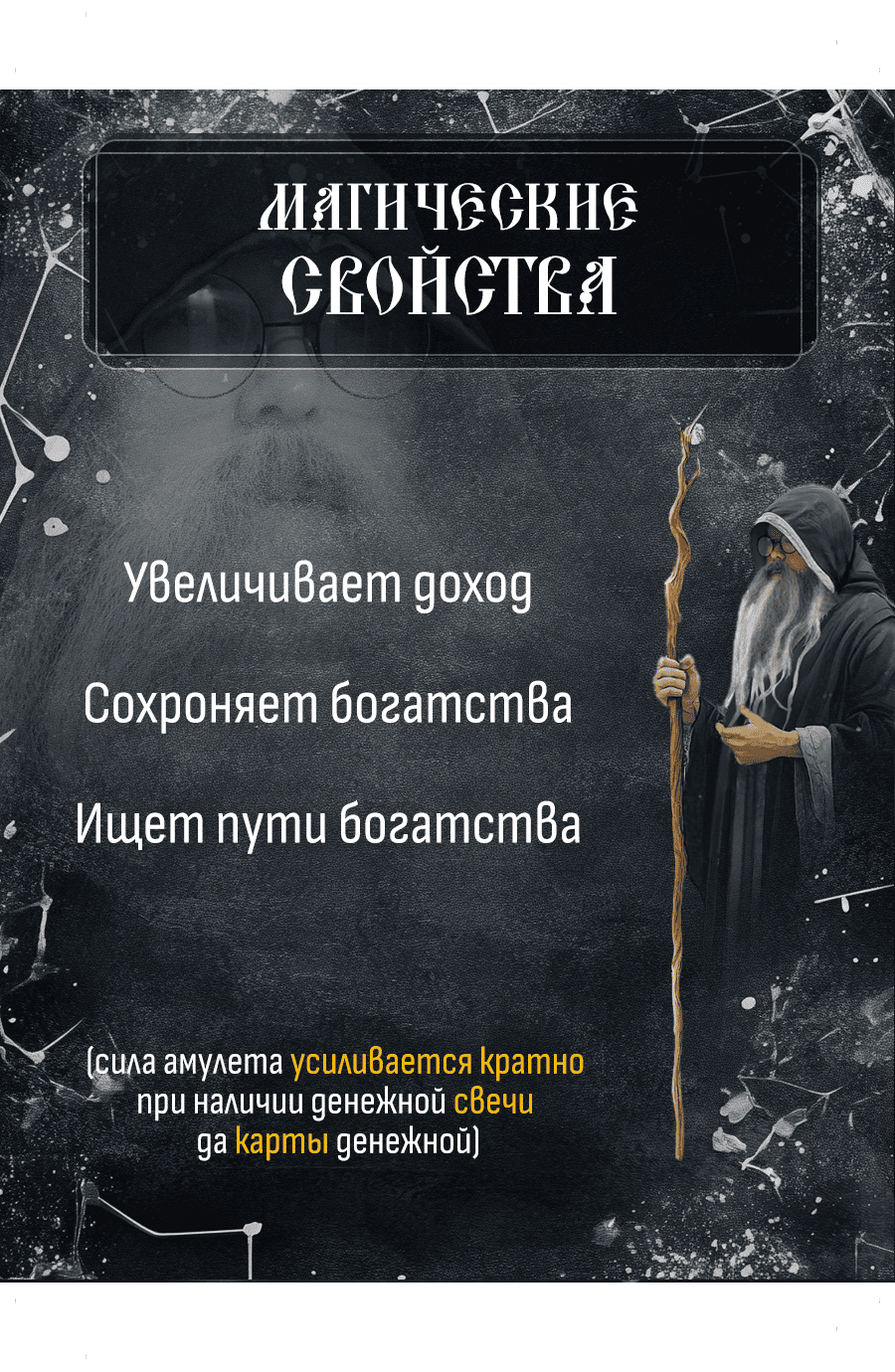Прекрасный мой друг, сия денежная Амулет поможет тебе стать настолько богатым, на сколько это необходимо тебе. Ровно на столько, на сколько нуждаешься в средствах. Да коли веруешь ты, что достоин большего! Знаешь, что стезя твоя тяжка, но должна быть вознаграждена! Уже представляешь, зачем нужны тебе эти богатства! И веришь в магию амулеты — она поможет тебе.